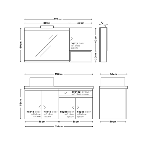 Διαστάσεις Καθρέπτη: M120 ( Ντουλαπάκι-Ράφι :Π 80+40 Υ 20 +40 ) xY60 εκ.