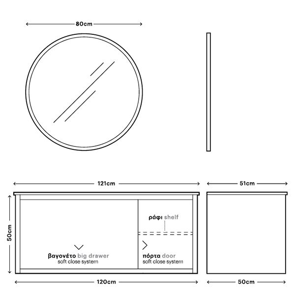 Διαθέσιμες διαστάσεις 121cm με νιπτήρα solid surface, σε οκτώ αποχρώσεις δρυς
