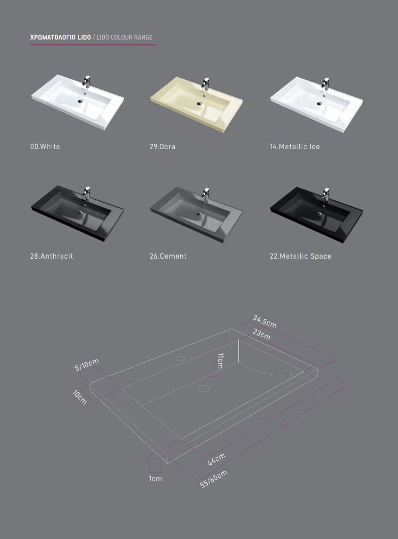 Ο νιπτήρας διατίθεται στα χρώματα: 00-White Λευκό, 29-Ocra Ώχρα, 14-Metallic Ice, 28-Anthracit, 26-Cement,22- Metallic Space.
