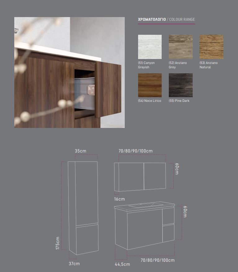 στα χρώματα: Canyon Greyish, Anziano Grey, Anziano Natural, Noce Lirico, Pine Dark.