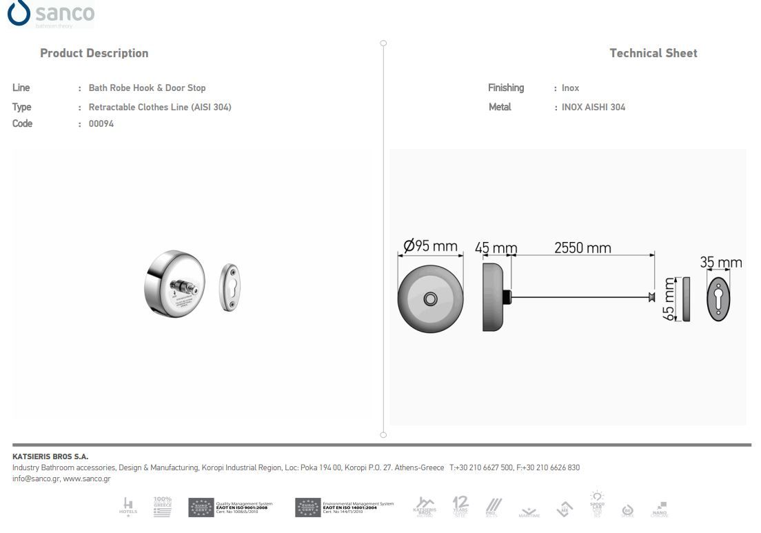 Αναδιπλούμενο Σχοινί για Άπλωμα Ρούχων Επιτοίχιο Chrome Sanco Hotel 094-A90