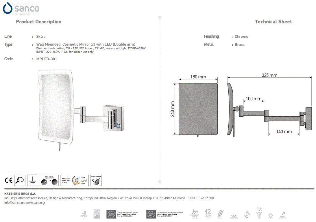 Επιτοίχιος Μεγεθυντικός Καθρέπτης x3 με Διπλό Βραχίονα Led 5 w 220-240V Chrome Sanco Led Cosmetic Mirrors MRLED-301-A03Ειδική Τιμή 234,00 € Κανονική τιμή 260,00 €