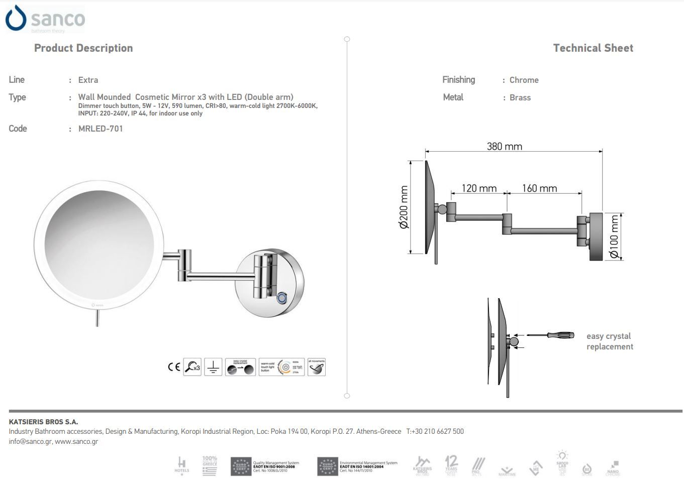 Περιγραφή: Επιτοίχιος Μεγεθυντικός Καθρέπτης x3 με Διπλό Βραχίονα