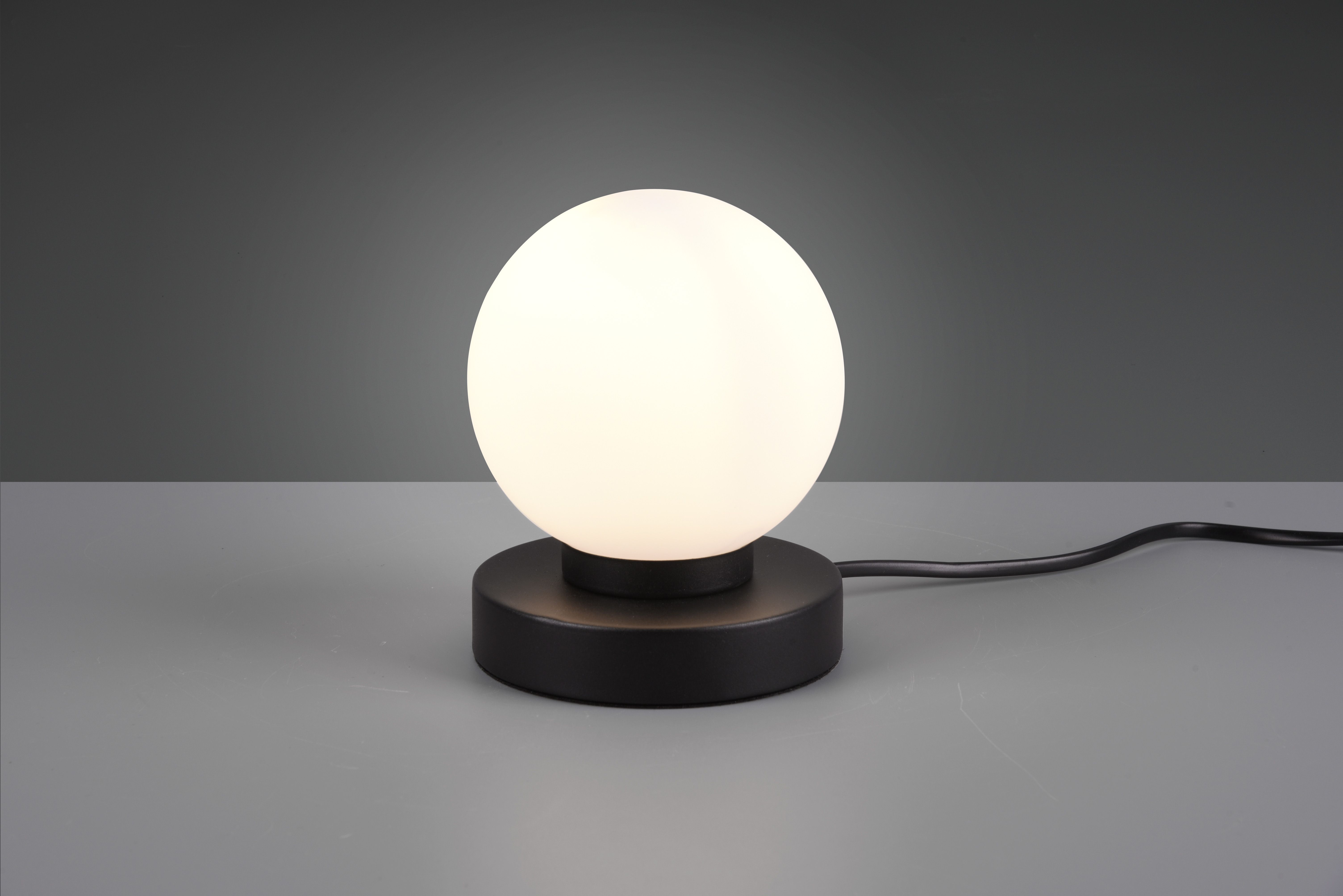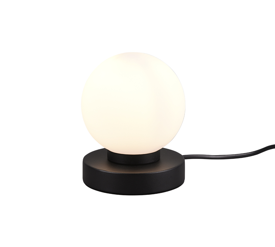 The lamp has a white glass shade and the base is in black matt.