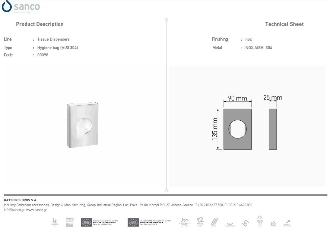 Θήκη για σακουλάκια Υγιεινής Επίτοιχη Sanco Tissue Dispensers 098-M116
