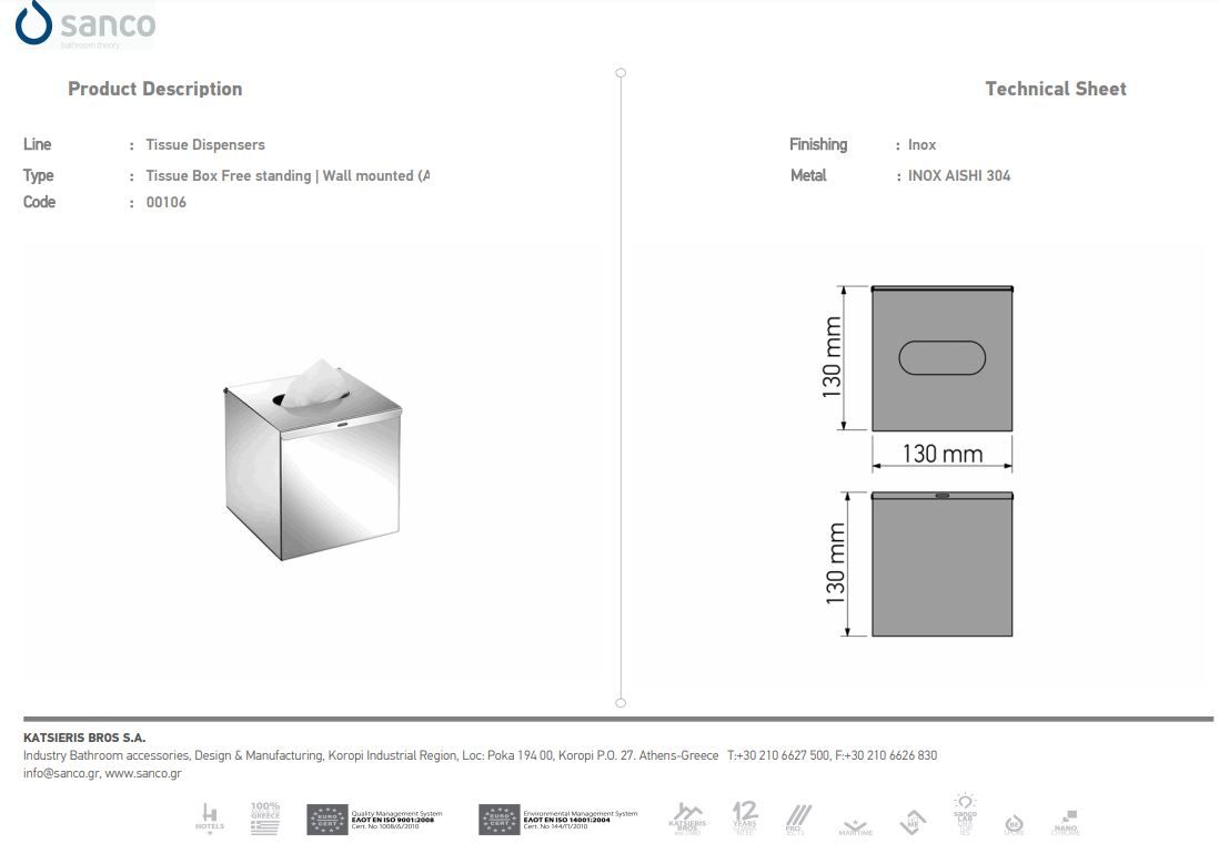 Θήκη Box για Χαρτομάνδηλα Επικαθήμενη-Επίτοιχη W13xD13xH13cm Aishi 304 Sanco Tissue Dispensers Black Mat 0106-M116Ειδική Τιμή 49,50 € Κανονική τιμή 55,00 €