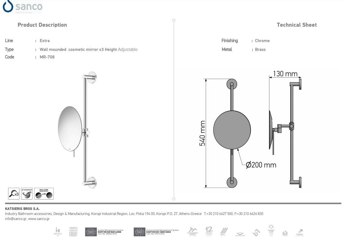 Καθρέπτης Μεγεθυντικός Επιτοίχιος Ρυμθιζόμενου Ύψους Ø20 εκ. Μεγέθυνση x3 Chrome Sanco Mirrors MR-708-A03Ειδική Τιμή 121,50 € Κανονική τιμή 135,00 € -