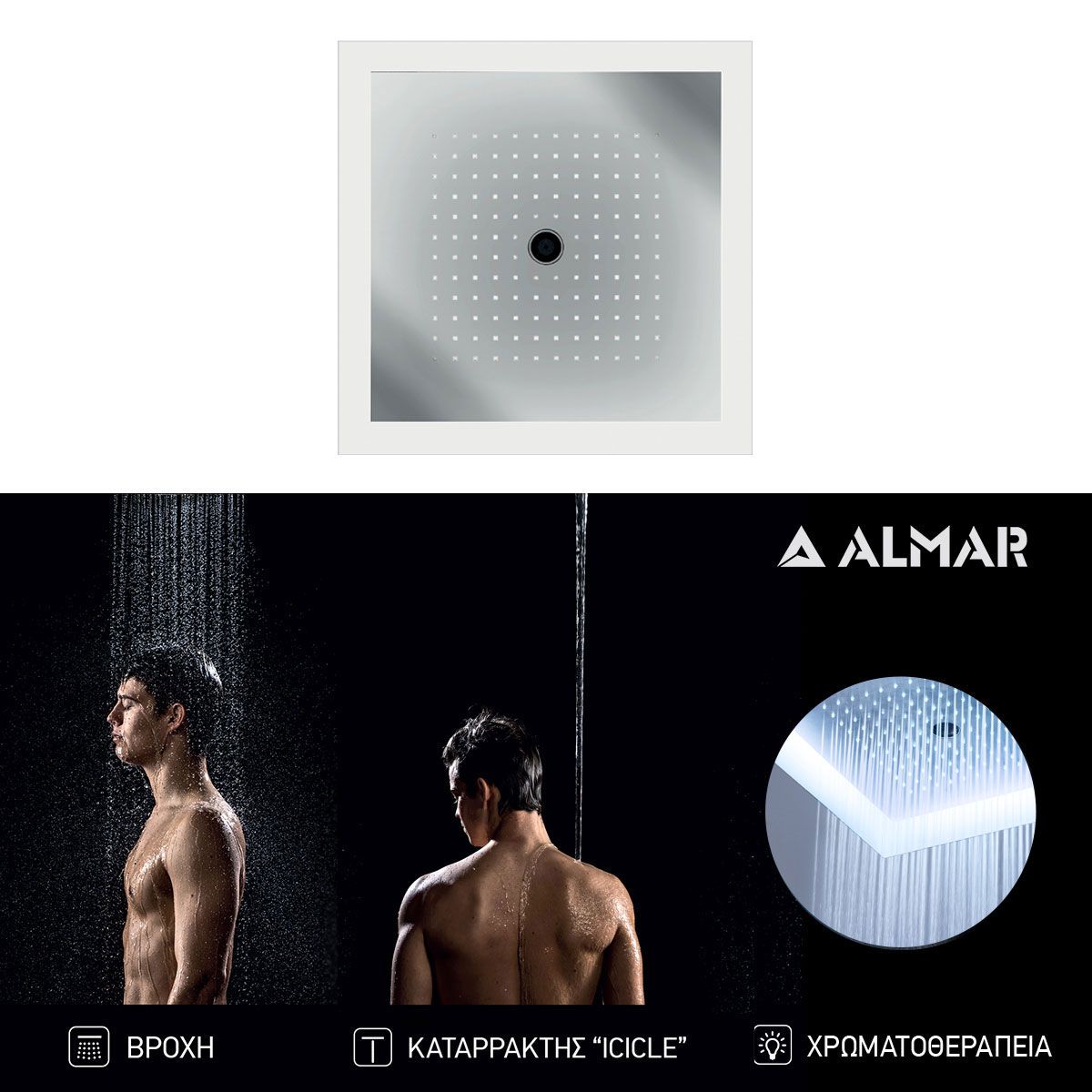 Κεφαλή Ντουζ Εντοιχισμού Οροφής 47x47 Icicle με Χρωματοθεραπεία χωρίς πλαίσιο στήριξης, Almar Inox Chrome E044275-100
