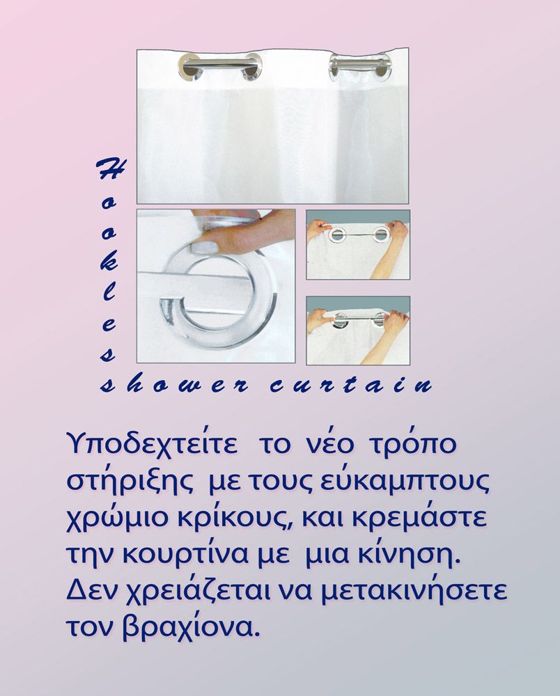 Με ενσωματώμενους κρίκους που δίνουν μια άλλη αισθητική και πολυτέλεια στο μπάνιο σας, ενώ ταυτόχρονα σας επιτρέπουν να κρεμάσετε και να ξεκρεμάσετε την κουρτίνα σε ελάχιστο χρόνο.
