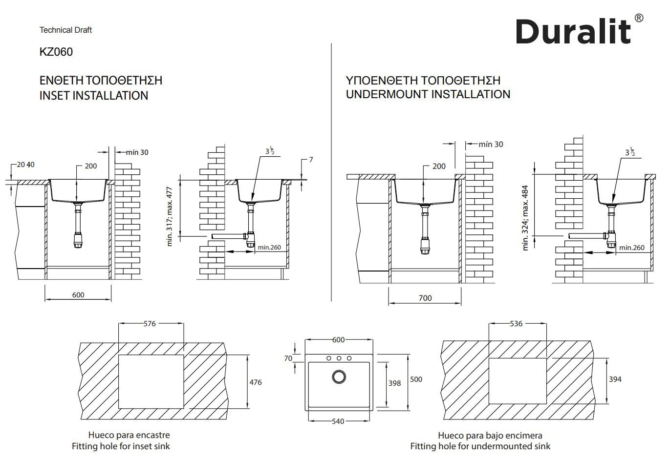 Νεροχύτης Κουζίνας Συνθετικός Υποκαθήμενος 60x50 Duralit Graphite KZ060U-420