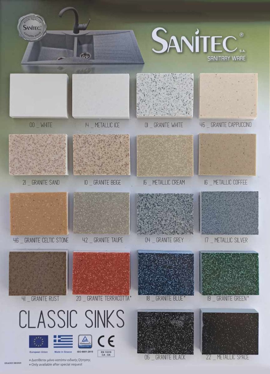 * Οι νεροχύτες Sanitec, απόλυτα εναρμονισμένοι με τις σύγχρονες τάσεις στη διακόσμηση, διατίθενται σε πολλές σειρές μοντέλων και σε μεγάλη ποικιλία αποχρώσεων "γρανίτη" και "ορυκτών μετάλλων".