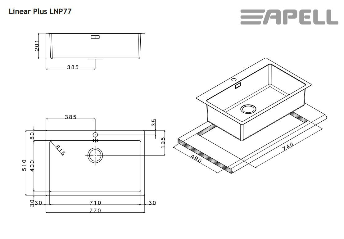 Νεροχύτης Κουζίνας Ανοξείδωτος Linear plus 77x51 Αpell Inox Λείο LNP77-110