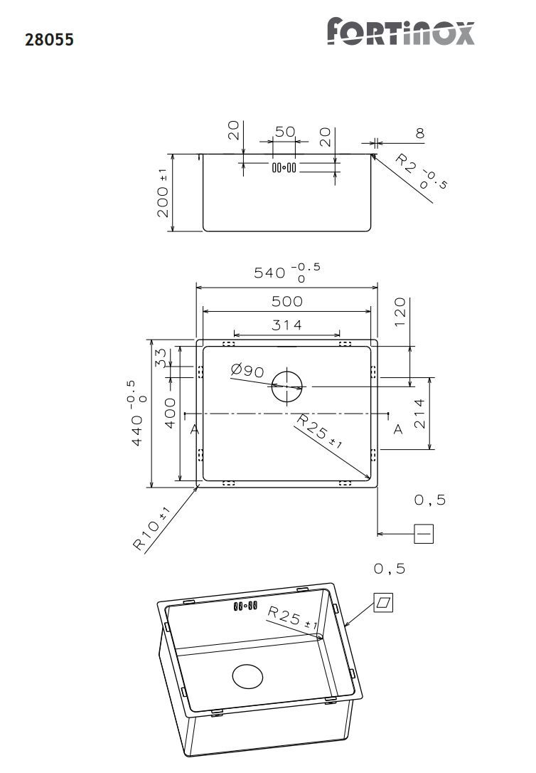 Νεροχύτης Κουζίνας Ανοξείδωτος Υποκαθήμενος Squadro 54x44 Fortinox Inox Λείο 28055-110