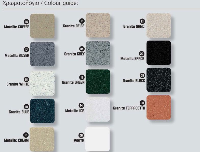 Διατίθεται σε Λευκό χρώμα ή σε ποικιλία αποχρώσεων με γρανιτική ή μεταλλική εμφάνιση.