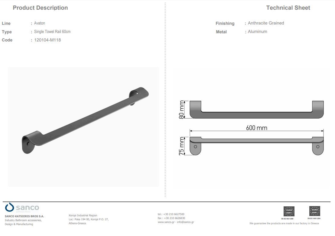 Άγκιστρο Μονό Επίτοιχο Sanco Avaton Antracite Grained 120108-M118Ειδική Τιμή 36,00 € Κανονική τιμή 40,00 € -