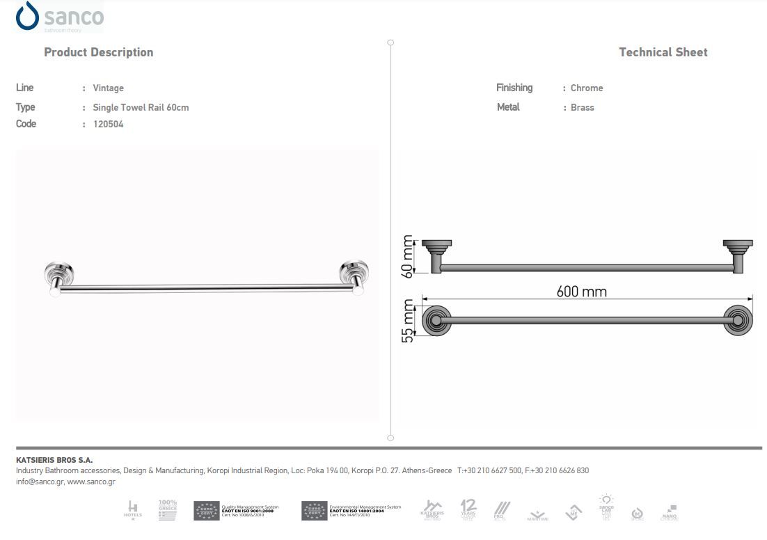 Πετσετοθήκη Μονή 60 εκ.Επίτοιχη Chrome Sanco Vintage 120504-A03Ειδική Τιμή 58,50 € Κανονική τιμή 65,00 €
