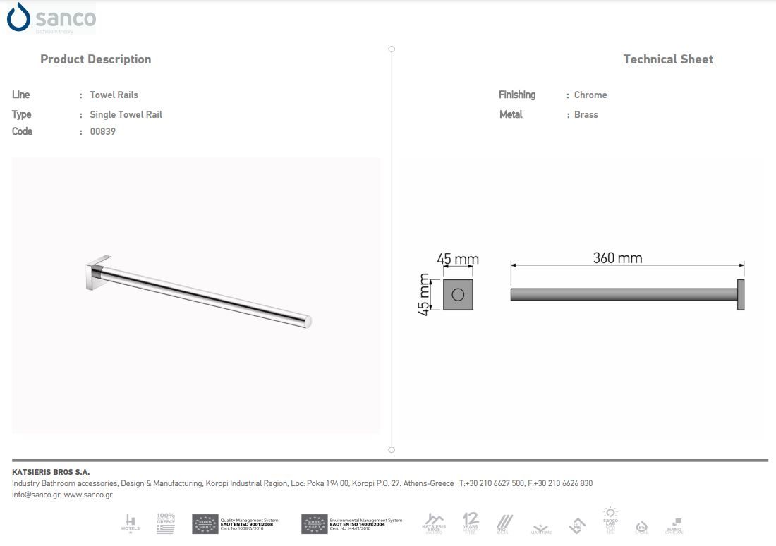Πετσετοκρεμάστρα Μονή Κάθετης Στήριξης W5,5xD36xH5,5 cm Chrome Sanco Towel Rails 0831-A03Ειδική Τιμή 40,50 € Κανονική τιμή 45,00 € -
