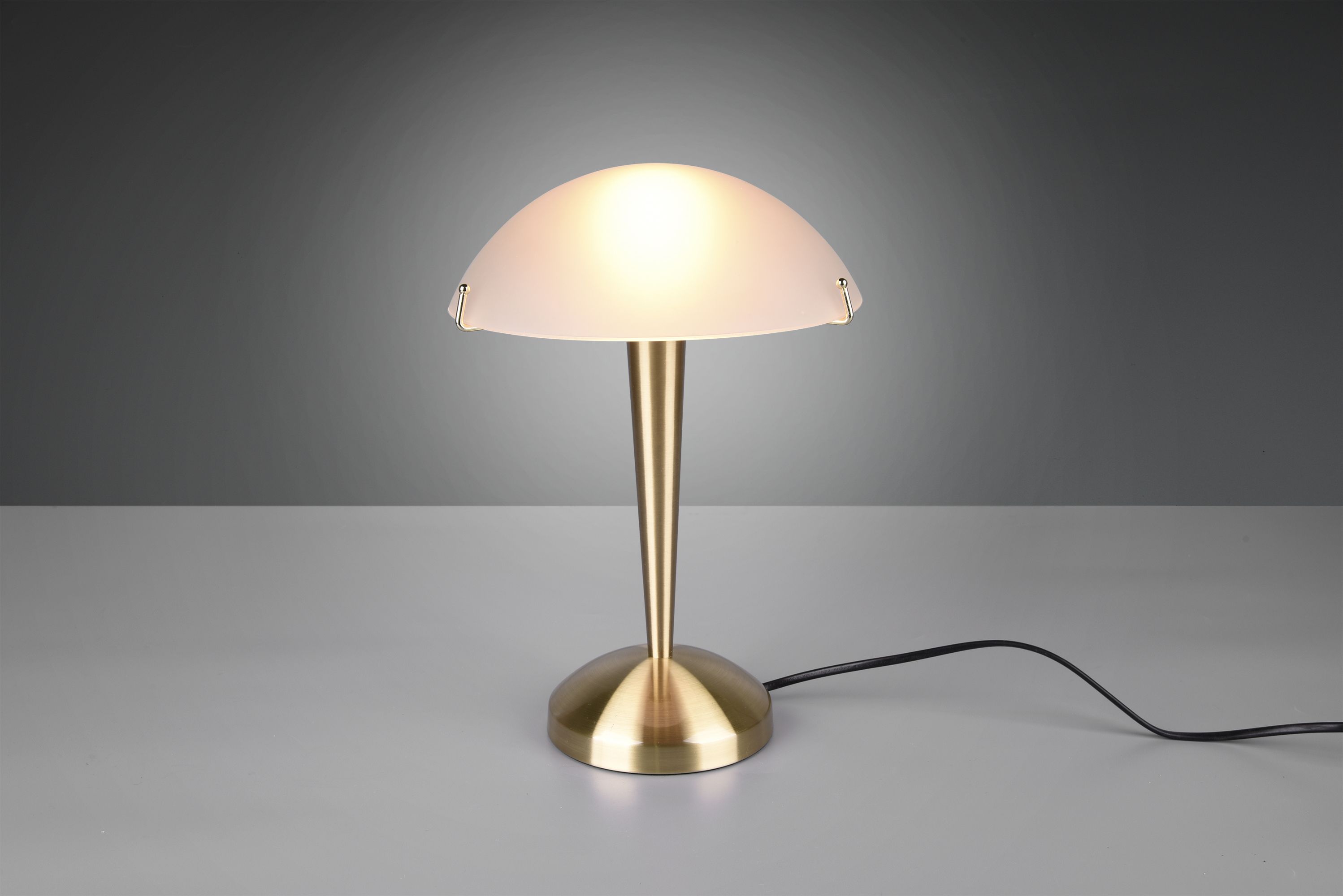 The clear, understated design consists of a base in matt brass and a chic lampshade in white.