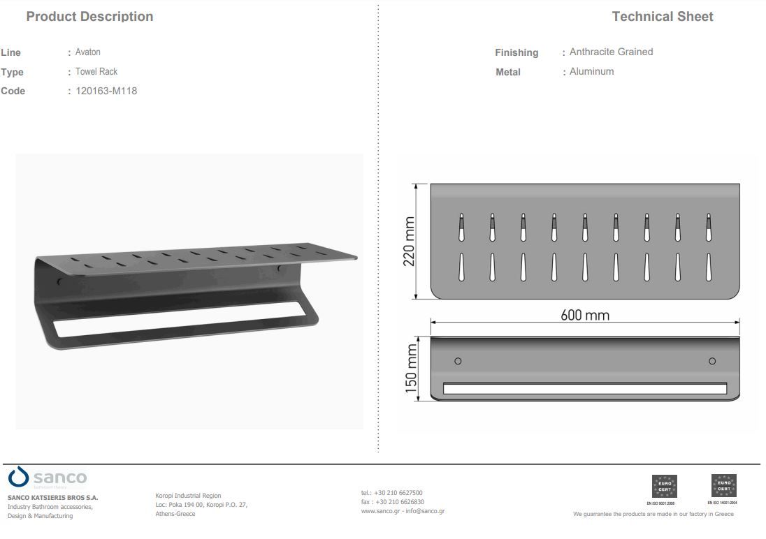 Πετσετοθήκη Επίτοιχη 60εκ.Avaton Antracite Grained 120104-M118Ειδική Τιμή 67,50 € Κανονική τιμή 75,00 € -