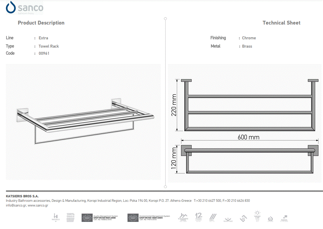 Ραφιέρα Πετσετών W60xD22xH12 εκ. Χρωμέ Sanco Towel Racks 0961-A03