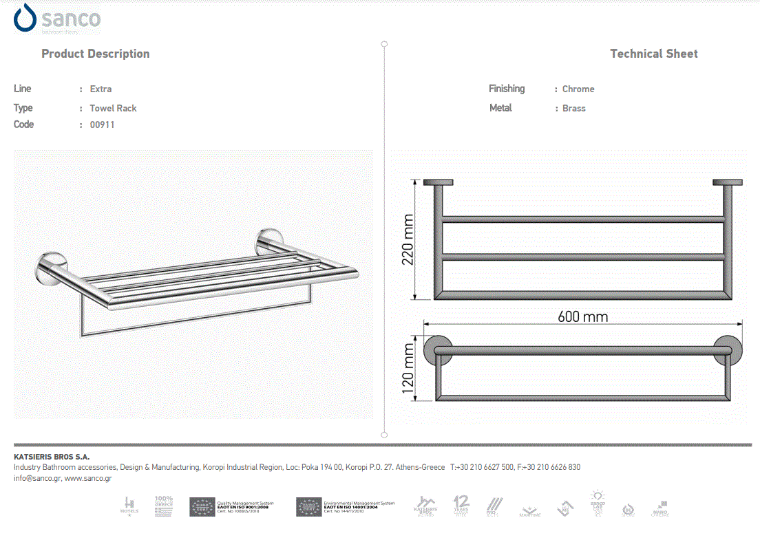 Ραφιέρα Πετσετών W60xD22xH12 εκ. Χρωμέ Sanco Towel Racks 0961-A03Ειδική Τιμή 81,00 € Κανονική τιμή 90,00 € -