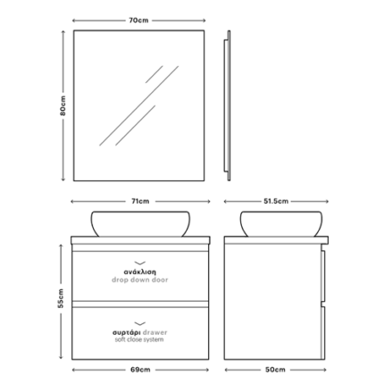 Σετ Έπιπλο Μπάνιου Μ71xB50xY55cm Βάση-Πάγκος-Νιπτήρας-Καθρέπτης Laminate Μελαμίνη MDF Cemento Savvopoulos Funky 005