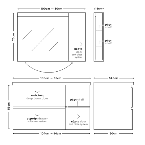 Η βάση του επίπλου διαθέτει δύο συρτάρια το ένα με ανάκλιση και δεξιά δύο ράφια. Στον αποθηκευτικό χώρο μπορείτε να αποθηκεύσετε πετσέτες, καλλυντικά και οτιδήποτε είναι χρήσιμο στην καθημερινότητά σας.