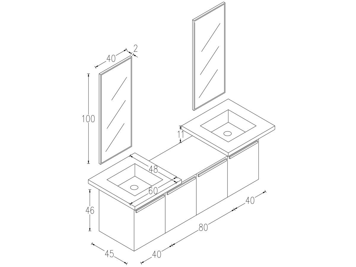 Περιγραφή: Βάση Επίπλου Κρεμαστού, δύο ντουλάπια 40εκ. & 1 ντουλάπι των 80 εκ.με εσωτερικό ράφι, δύο επικαθήμενους νιπτήρες.Διαστάσεις: Π160*Υ46*Β45 cm