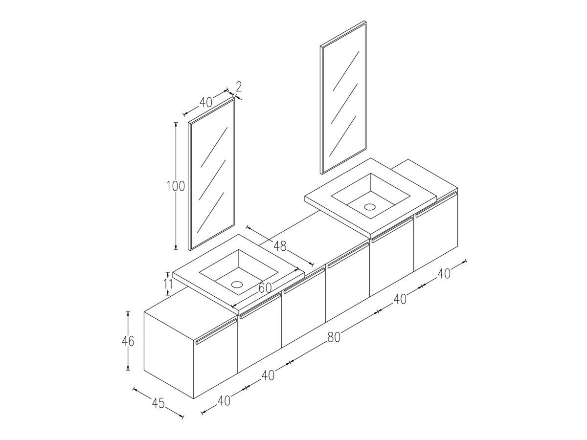 Περιγραφή: Βάση Επίπλου Κρεμαστού, τέσσερα ντουλάπια 40εκ. & 1 ντουλάπι των 80 εκ.με εσωτερικό ράφι, δύο επικαθήμενους νιπτήρες.