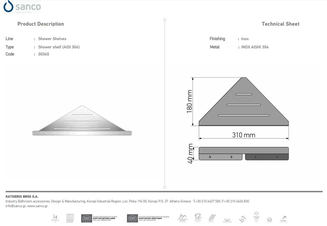 Σπογγοθήκη-Ραφιέρα Γωνιακή Επιτοίχια W31xD18xH4cm Inox Aishi 304 Sanco Shower Shelves 0345-A90Ειδική Τιμή 49,50 € Κανονική τιμή 55,00 € -