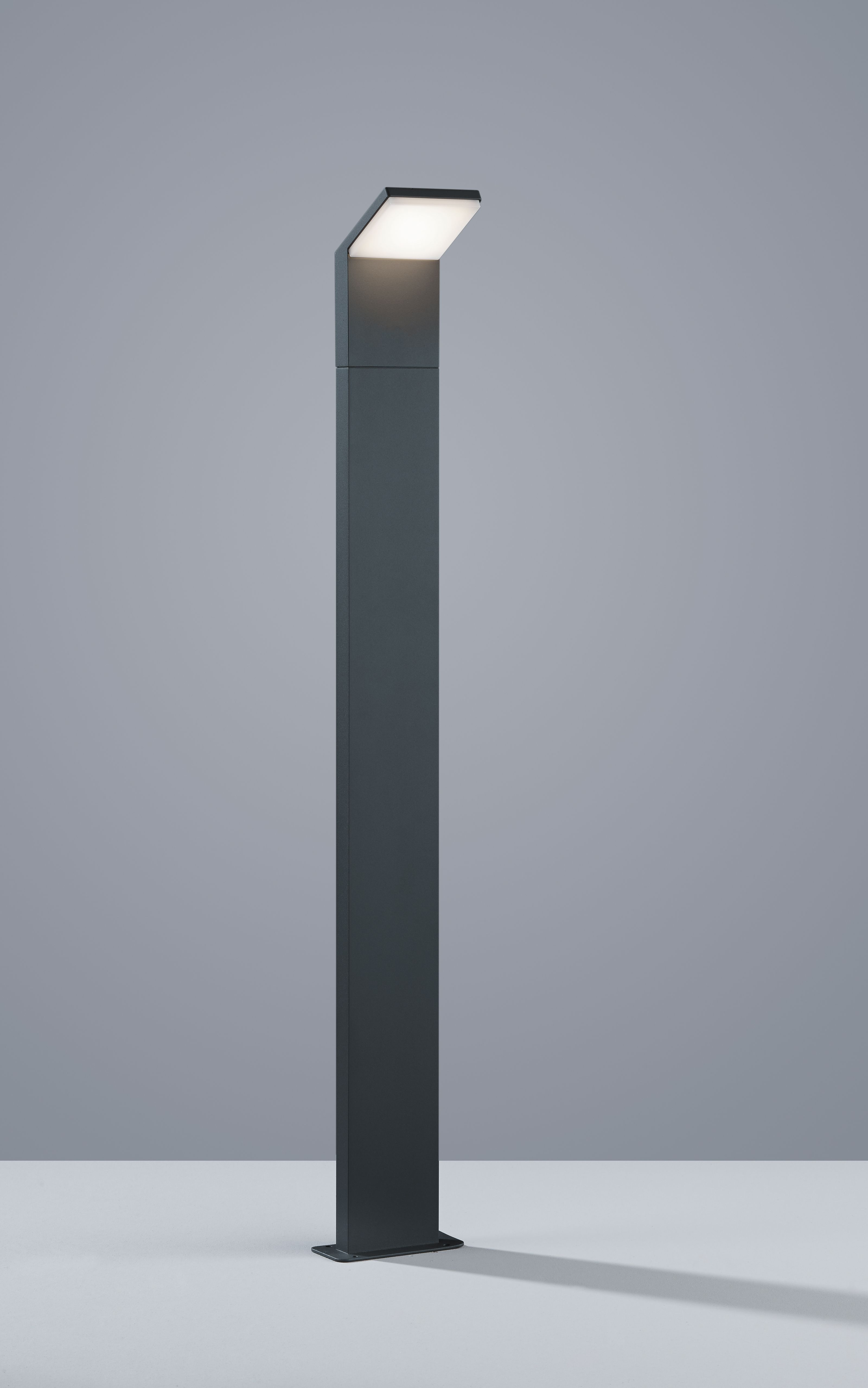 The pathway light impresses with a housing made of anthracite-colored die-cast aluminum and a slanted light shade made of white plastic.