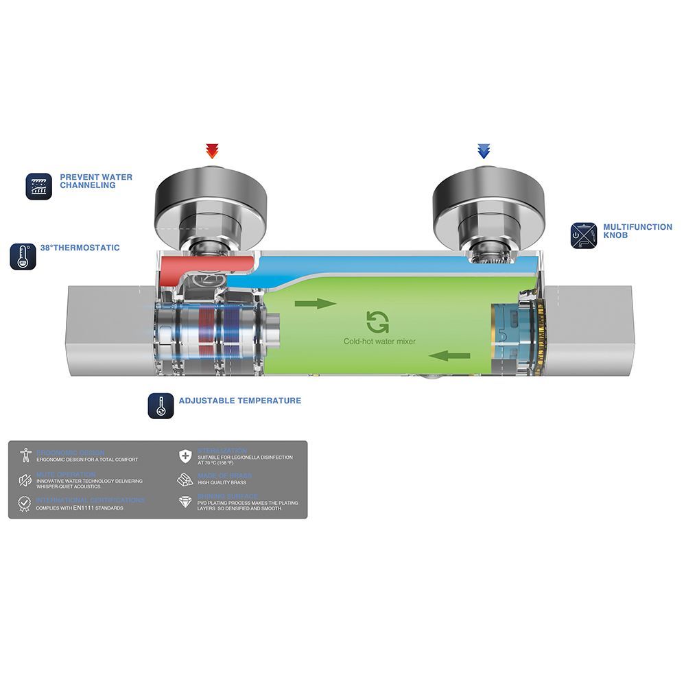 Ορειχάλκινη βέργα ντουζ με θερμοστατική μπαταρία, σπιράλ βαρέως τύπου σύμφωνα με τα standards DVGW, κατάλληλο για πόσιμο νερό και με μεγάλη αντοχή σε αυξομειώσεις της πίεσης. Γόνατα (connectors) βαρέως τύπου που σας γλυτώνουν από διαρροές που μπορούν να προκληθούν από υψηλή πίεση του νερού. Οικονομία στο νερό μέχρι και 30% σε σχέση με τις κοινές μπαταρίες χάρη στον ειδικό σχεδιασμό και το φίλτρο της μπαταρίας. Πολύ χαμηλό επίπεδο θορύβου κατά τη χρήση. Όλα τα επιμέρους υλικά κατασκευής, όπως λάστιχα, φλάντζες, μηχανισμοί είναι πιστοποιημένα και κατάλληλα για πόσιμο νερό.